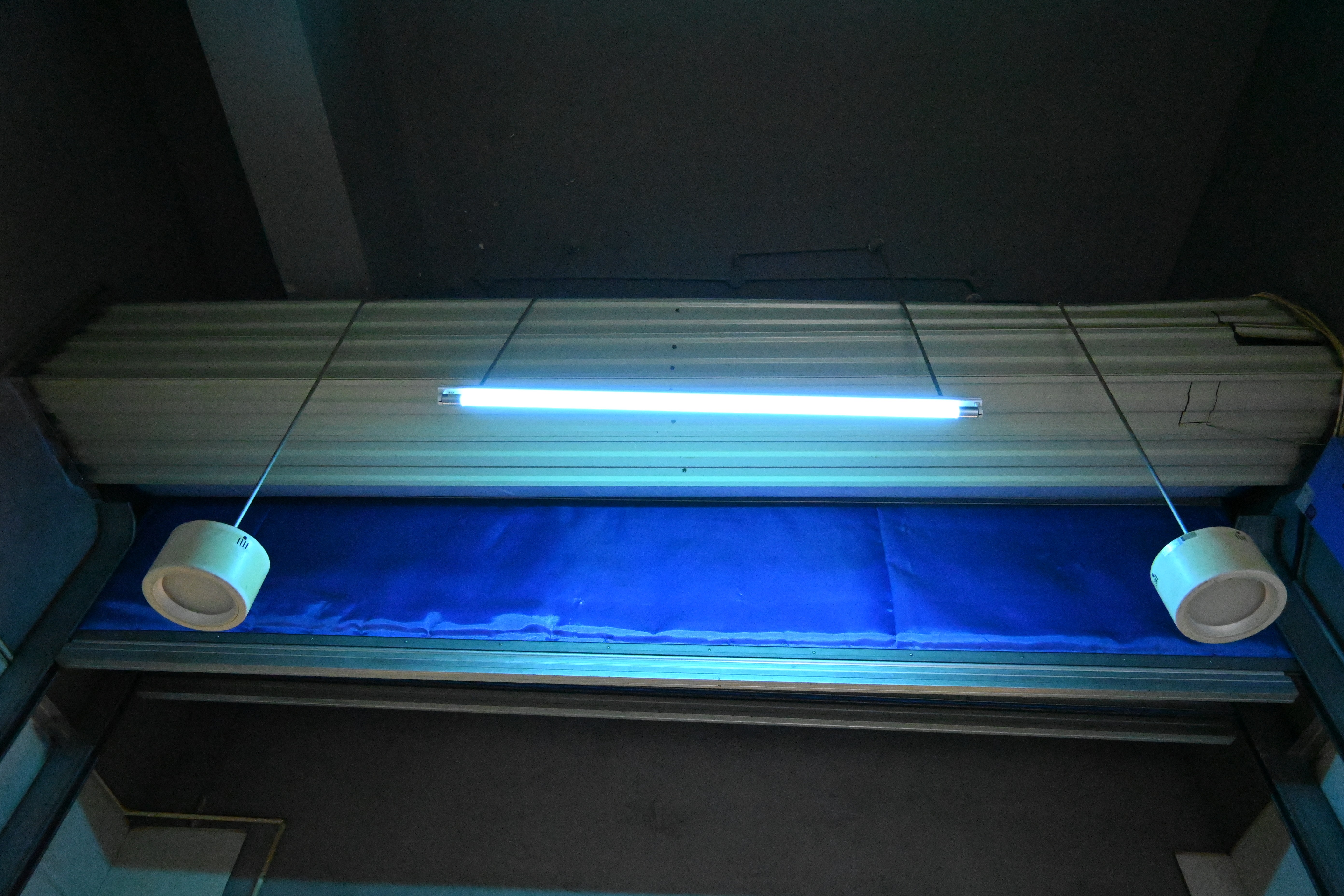 圖為:晚間收檢場(chǎng)售賣間正在進(jìn)行紫外線消毒
