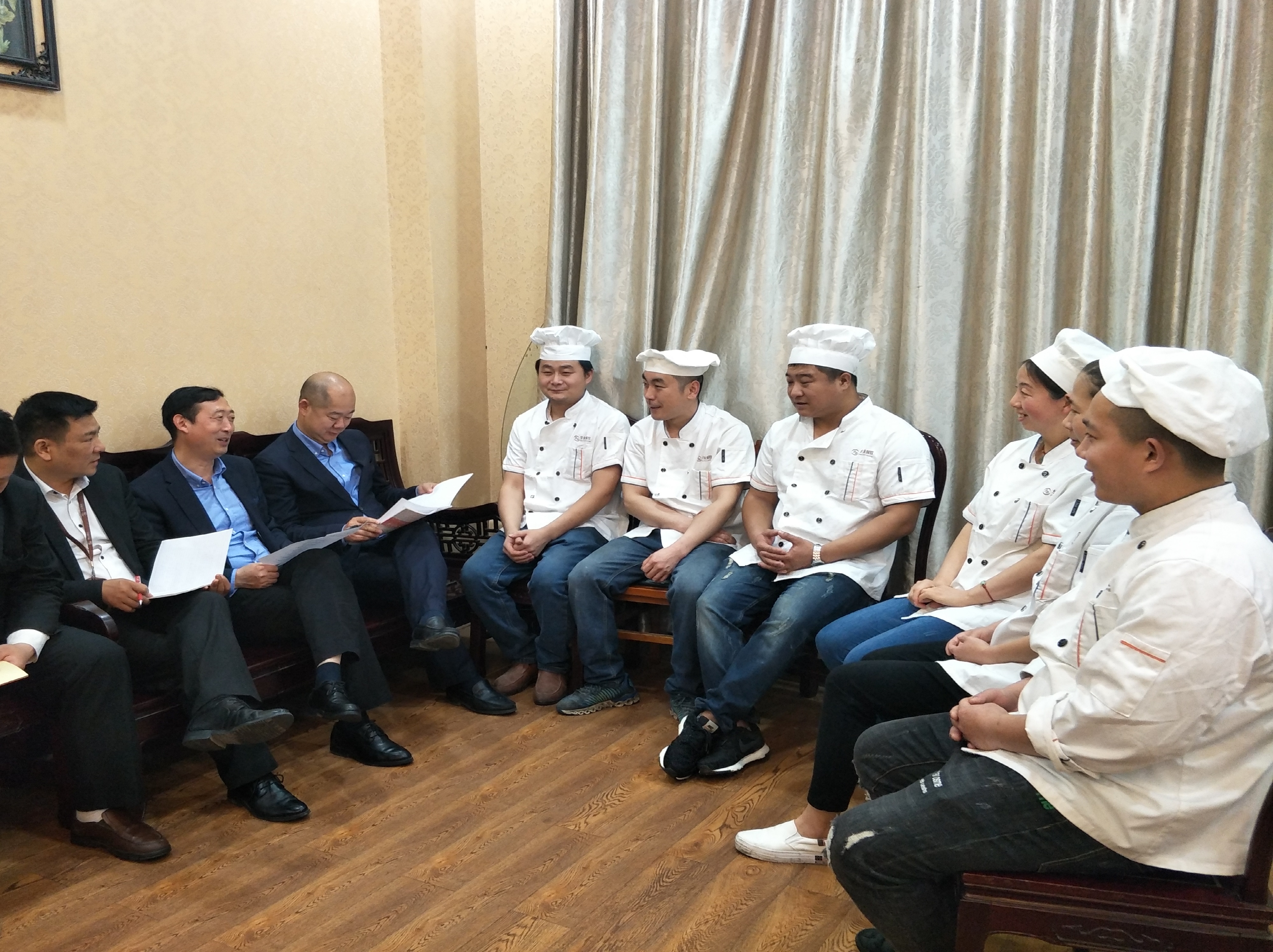 圖為:區(qū)域總監(jiān)座談班組負(fù)責(zé)人,指導(dǎo)食堂經(jīng)營(yíng)工作