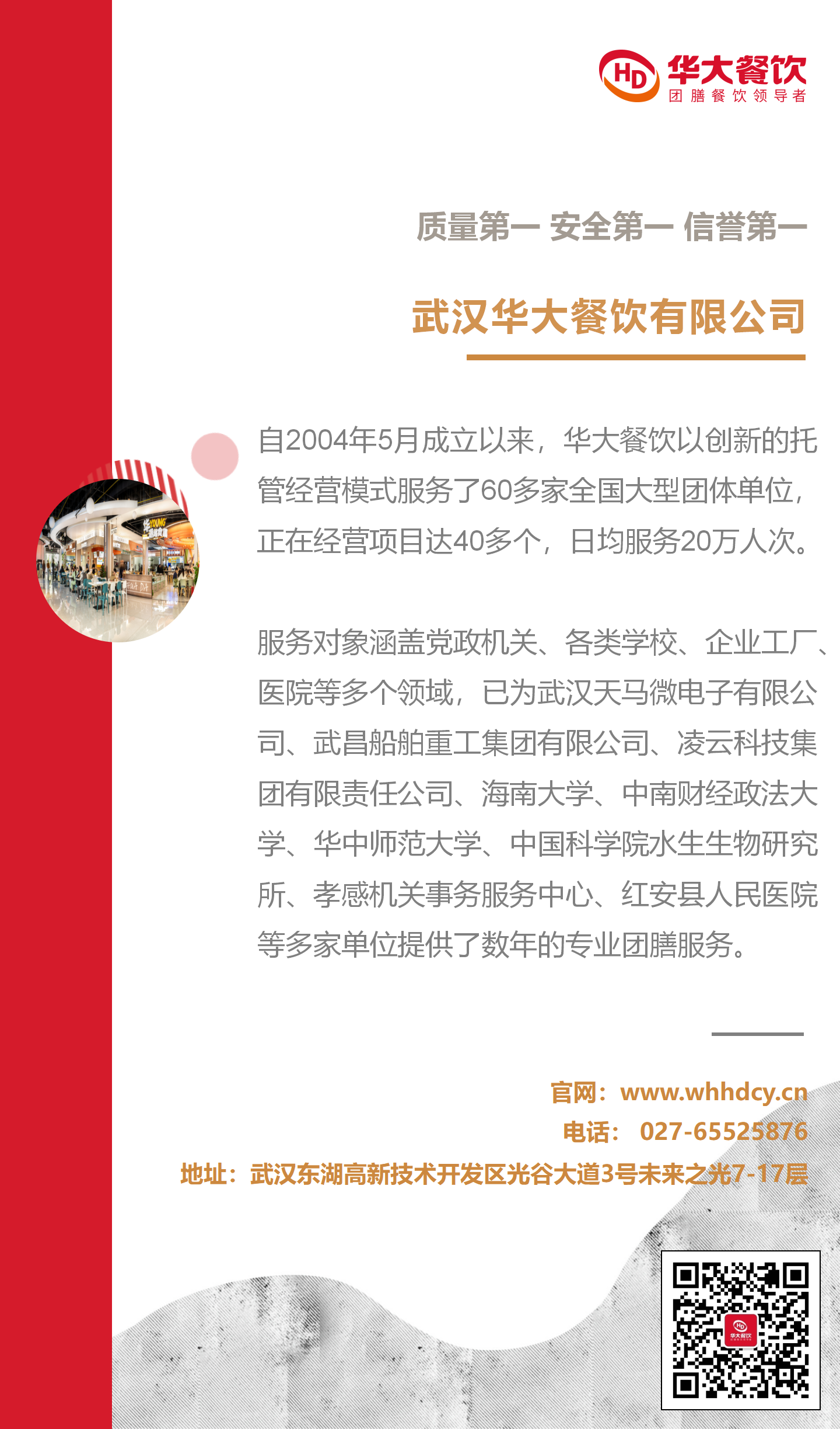 武漢華大餐飲不斷探索與累積成功的管理經(jīng)驗,形成行之有效的餐飲經(jīng)營管理體系,在保質(zhì)保量保安全的奮斗之路上,孜孜不倦, 努力前行。